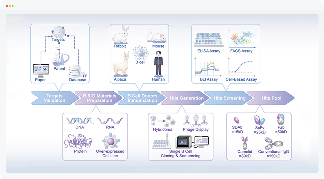 "针对不同表位、不同亲和力、不同分子形式的苗头抗体需要,我们建立了包括动物免疫、抗体制备、分子克隆、免疫学检测、筛选和功能评价等完整的抗体发现综合技术体系。我们的抗体发现科学家有丰富的项目经验,根据疾病的发病机制和靶点的特性综合考虑,制定个性化的抗体生产和筛选策略,能够提供更优质的候选功能抗体。"